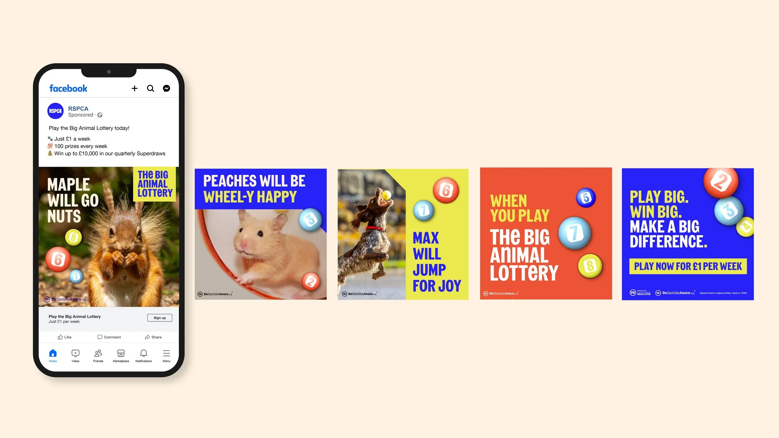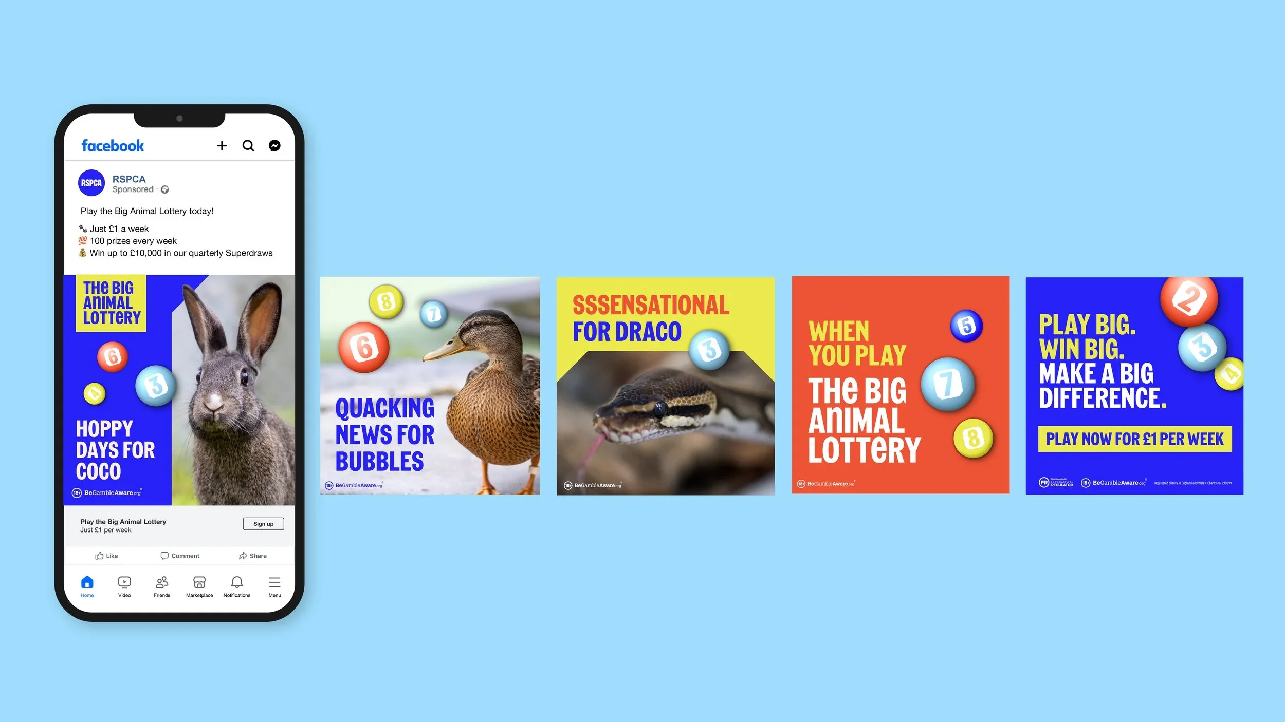 Charity lottery products sit in a crowded market, so to stand out we made our ads as fun as the game itself – packed with cheeky puns, adorable animal imagery, and a feel-good factor that’s truly off the chart.